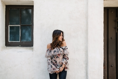 Willow and Clay is serving up all of the romantic vibes with this champagne, velvet burnout print, off the shoulder top. The Thea floral piece features a ruffle tier along the shoulders and a dramatic bell sleeve that has a beautiful laced hem. But, the chicness and femininity of the piece doesn't stop there. The brand threads a subtle metallic throughout the velvet burnouts to add a little spark and shine!
