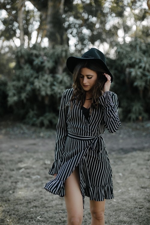 If you were to ask me my favorite combo of colors, I would say black and white -- every-single-time. Maybe it's because I'm a New Yorker, or because there is a no-fail coolness and chicness to the pairing, but I always gravitate towards these shades. So you can imagine that I was excited to see this long sleeve, lightweight and silky wrap mini dress from The Fifth Label. The feminine detailing, like the slim sleeve with a flared hem panel, v-neck, wrap silhouette and flared skit, meets with a touch of menswear style (hello, stripe!), creating a staple that will fit effortlessly into your wardrobe!